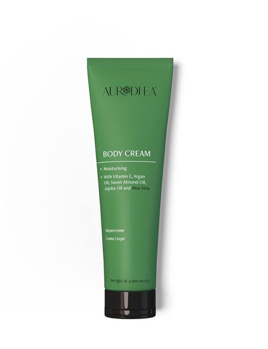 Die Aurodhea Körpercreme mit Aloe Vera spendet Feuchtigkeit, erfrischt und beruhigt die Haut. Die zart pflegende Textur fettet nicht und ist daher für alle Hauttypen und die tägliche Anwendung ideal. Dank der leichten, schnell einziehenden Formel kann das Produkt auch als Handcreme verwendet werden. Die Formel enthält zudem Sonnenblumen-, Süßmandel-, Jojoba- und Arganöl, die die Haut schützen und intensiv nähren. Die Haut fühlt sich angenehm gepflegt und samtweich an und erscheint frisch und glatt.